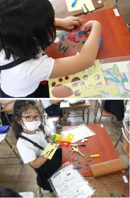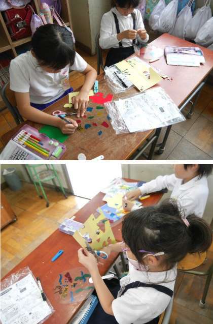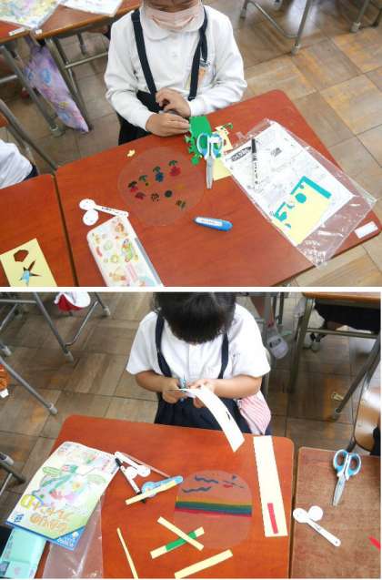 2年生では、透明なプラスチックのうちわに、セロハンをはって、きれいな絵や図柄をーのあるうちわにしあげていました。