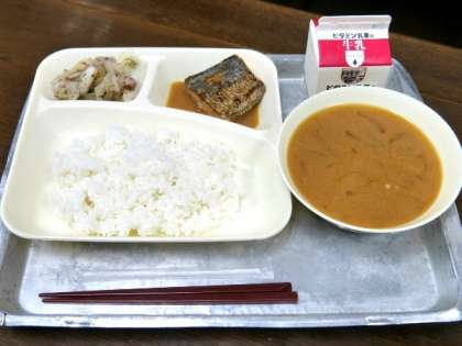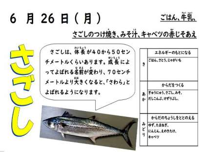 今日の献立は、さごしのつけ焼き、みそ汁、キャベツの赤じそあえ、ごはん、牛乳でした。
