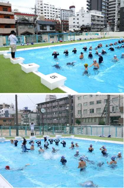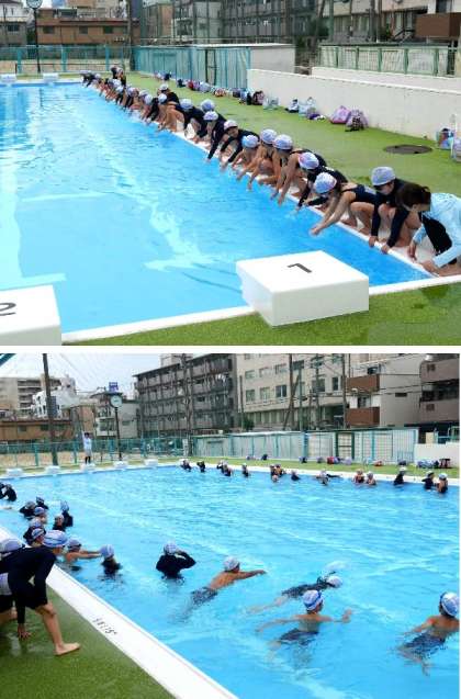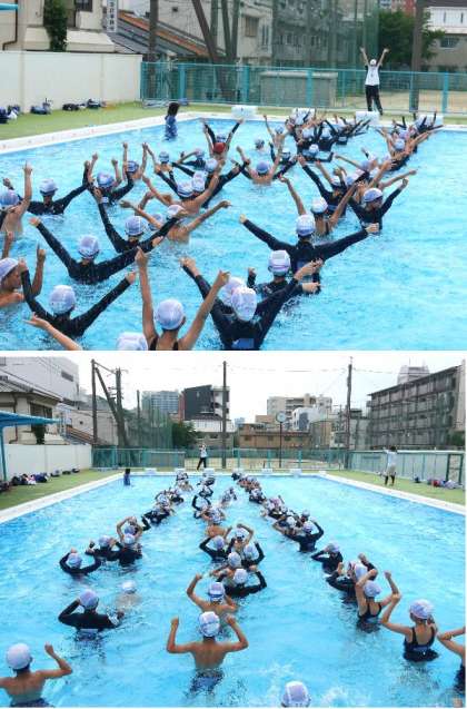 4年生がプールに入っています。昨年の運動会の団体演技で踊ったあの曲で、プールで運動しています。音楽がかかると、4年生が一斉に踊ります。