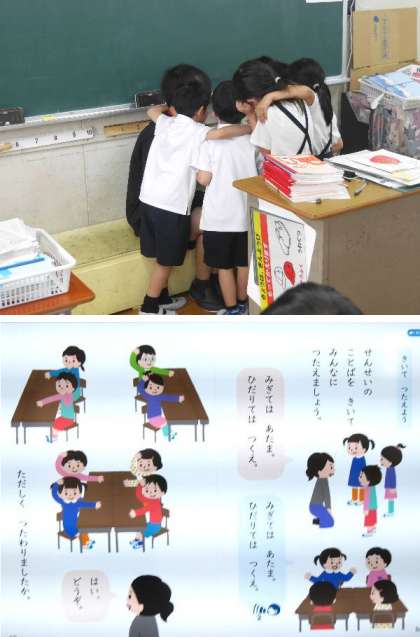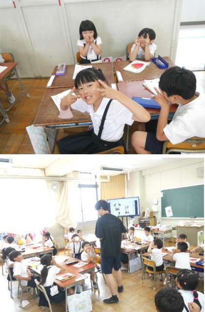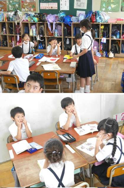 1年生では、先生の言葉を聞いて、みんなに伝える学習をしていました。先生から「カニ」と聞いてカニの手をだしています。