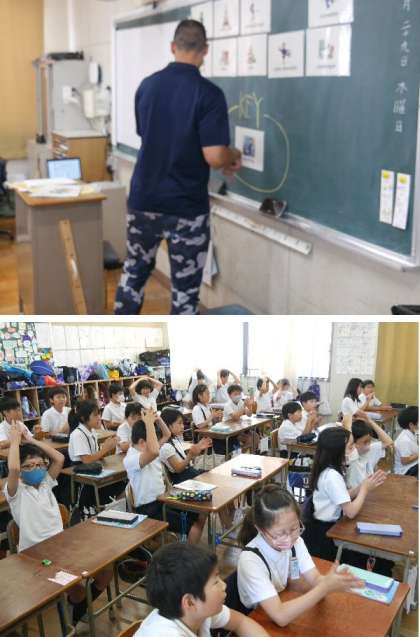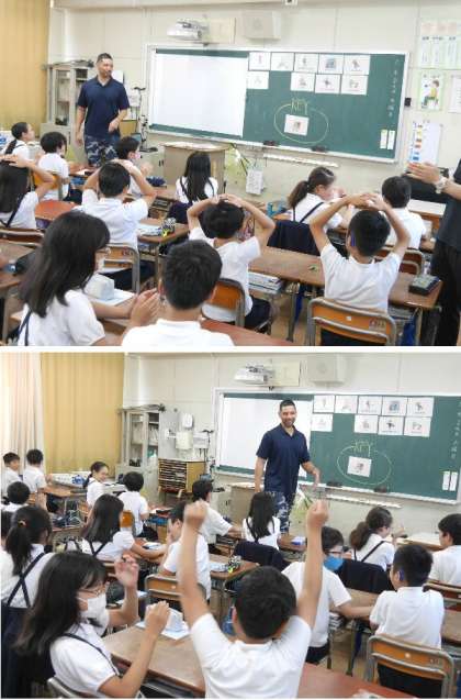 4年生の英語にクリス先生がきてくれました。黒板にはられた英単語の一つをキーワードにしてのゲームです。クリス先生からキーワードが言われたら、席のとなりの人と消しゴムをとりあいます。