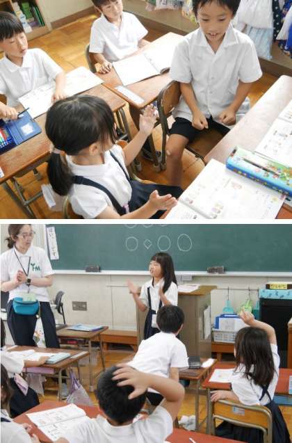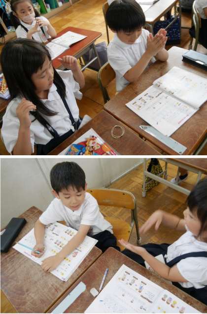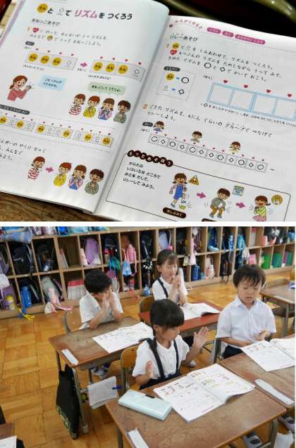 1年生が、手拍子でリズムについて学習しています。4つ分のリズムを「たん」と「うん」にしてリズムづくりをします。作ったリズムを自分で手拍子で確認して、友だちと発表しあっています。