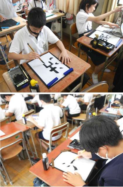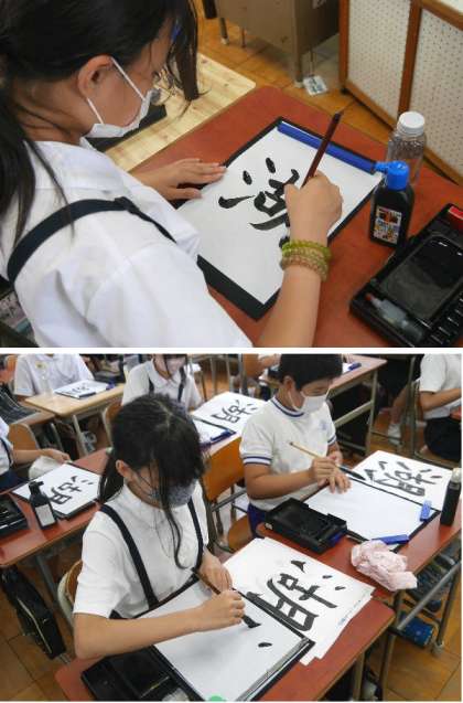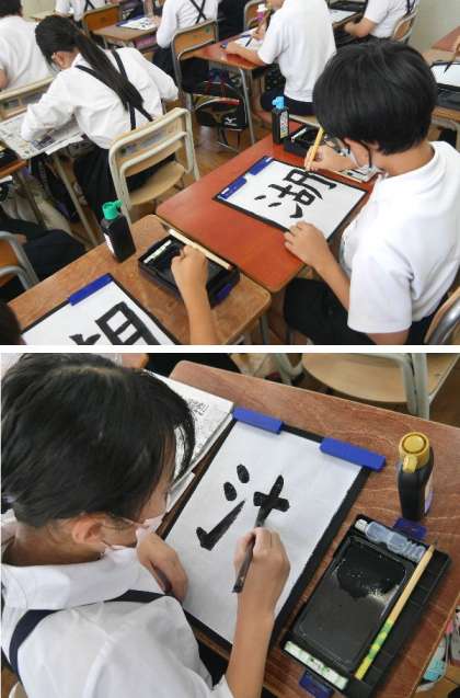 6年生が習字で「湖」を書いていました。3つのバランスが難しいですね。