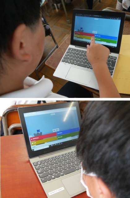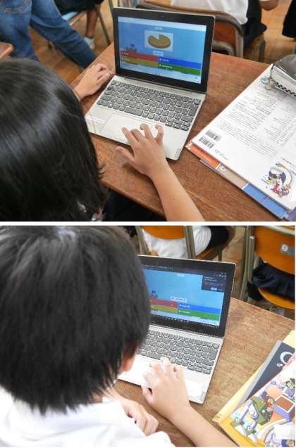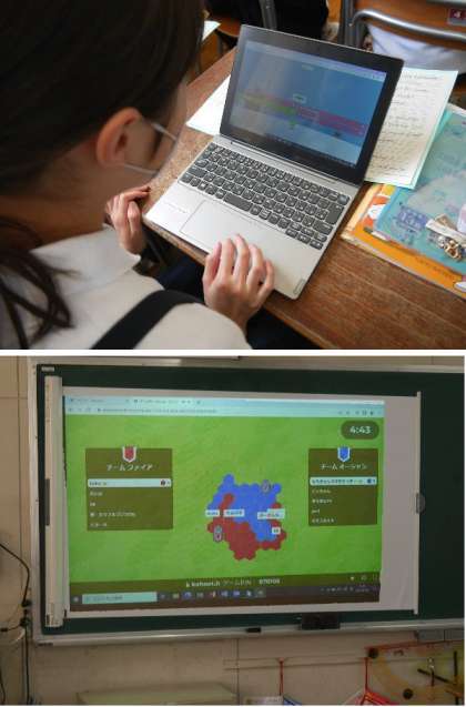 5年生では、クイズアプリ「Kahoot」を使って作られた英単語クイズに取り組んでいました。チームに分かれての対戦になっていて、クイズ正解のチームが領土をとっていきす。とても楽しそうです。