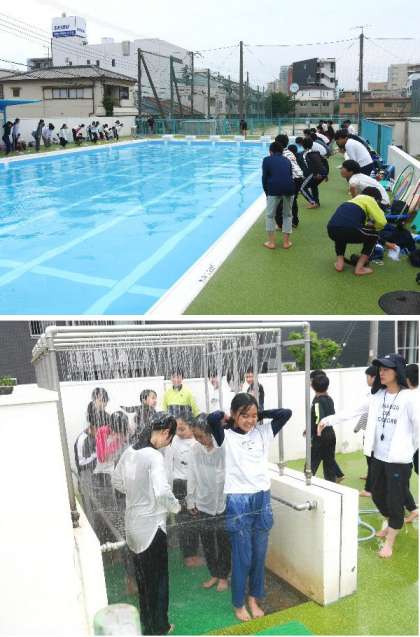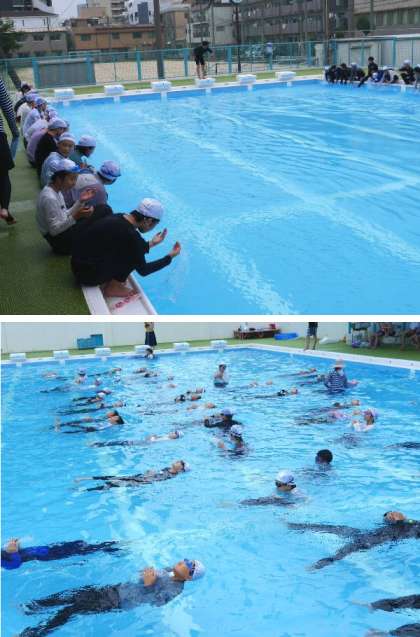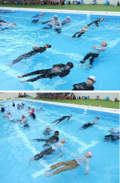 6年生は、着衣して水泳練習を行いました。災害や事故などから、自分自身を守る訓練です。ペットボトルで浮く練習もしました。