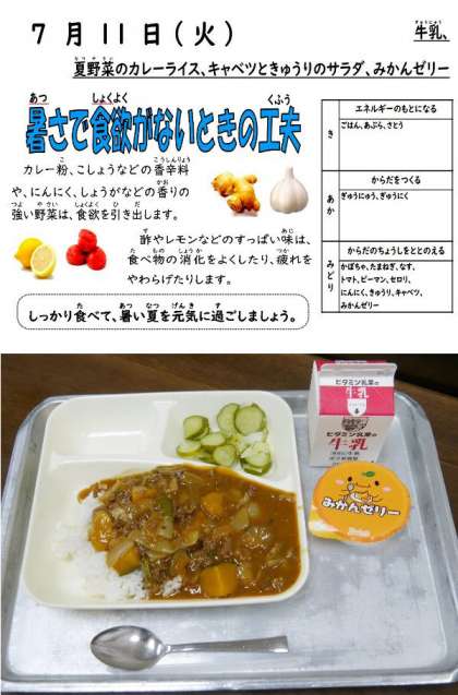 今日の献立は、夏野菜のカレーライス、キャベツときゅうりのサラダ、みかんゼリー、牛乳でした。