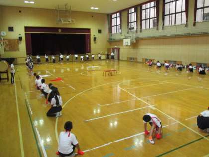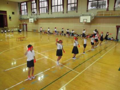 本当なら運動場で練習したかったところですが、雨のため体育館で行いました。