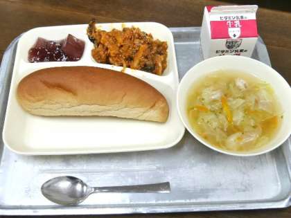 今日の献立は、なすのミートグラタン、スープ、ダイスゼリー(ぶどう)、黒糖パン、牛乳でした。
