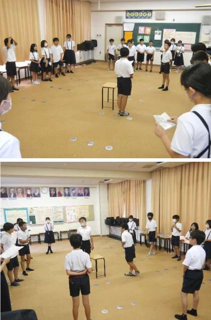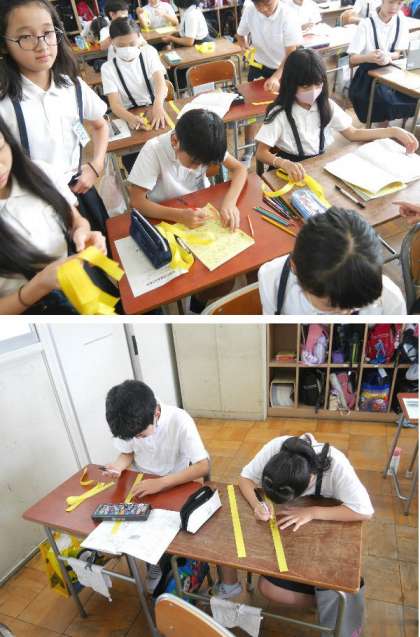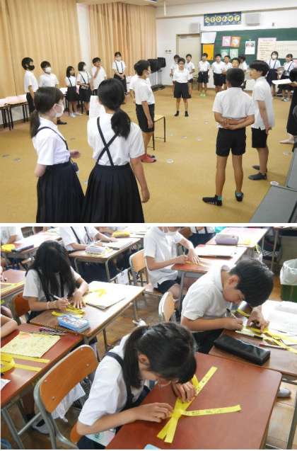5年生は今週末から林間学習があります。かばんにつけるリボンを準備したり、キャンプファイヤーの練習をがんばっています。