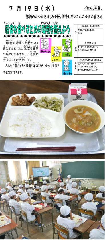 今日の献立は、豚肉のたつたあげ、みそ汁、切干だいこんのゆず香あえ、ごはん、牛乳でした。みんなで楽しく給食をいただきました。