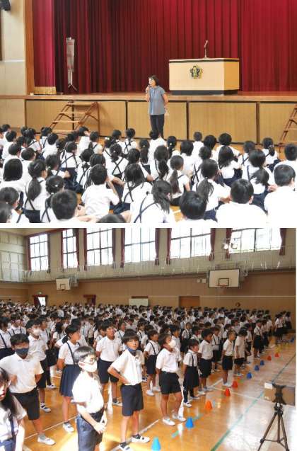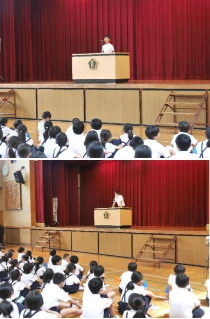 午後から、講堂で1学期末の終業式を行いました。校長先生から、充実した夏休みを過ごすための目当てをお話しました。5年児童代表から1学期をふりかえっての言葉があのました。最後に全員で校歌を歌いました。