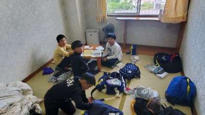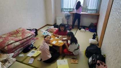 順番にお風呂に入っています。あいだにハガキを書いています。