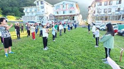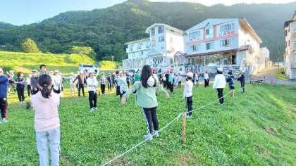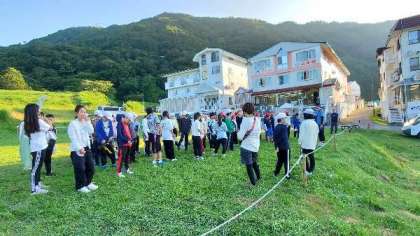 6時30分。広場で朝会をしました。ラジオ体操をして、今日も元気よく活動に取り組みます。
