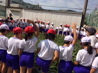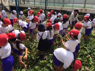 二年生全員で、第二グランドで育てているサツマイモの観察に行きました。雑草が伸びているので、全員で雑草抜きもしました。大きく育っている様子です。もうすぐ収穫。一年生を招待して、お芋パーティーを開くのが楽しみです。