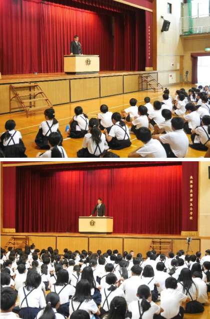 校長先生から、夏休みで不規則な生活になってしまっていた人は、生活リズムを整えましょう。学校にくる体調が悪かったり、不安がある人は、どの先生にでもいいので相談したり話をしてほしいとお話しました。そして、文部科学大臣 永岡桂子さんのメッセージを紹介しました。また、熱中症に気を付けてほしい、水分をこまめにとること、熱中症警戒アラートで危険な場合は運動場での運動は原則禁止などのお話やお願いをしました。