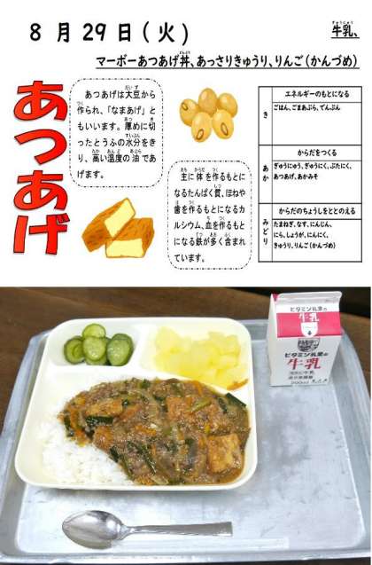 今日の献立は、マーボーあつあげ丼、あっさりきゃうり、りんご(缶)、牛乳でした。