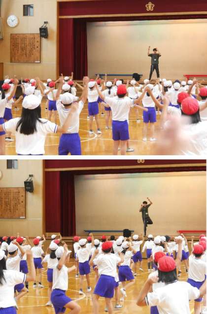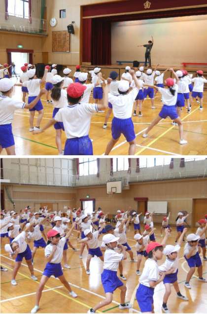 4年生が、講堂で運動会の団体演技の練習がはじまりました。4年生は元気いっぱいでふりつけを楽しんでいました。