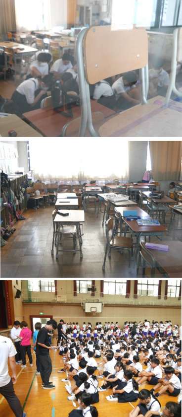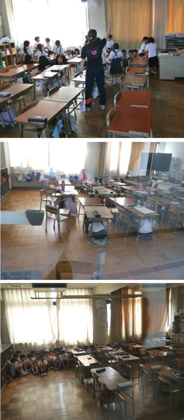 1学期は火事を想定した避難訓練をおこないました。2学期は不審者への対応訓練です。不審者が学校に入ってきた想定で、放送での連絡をうけて、近くの教室に避難をしてカギをしめて静かに身をかくします。