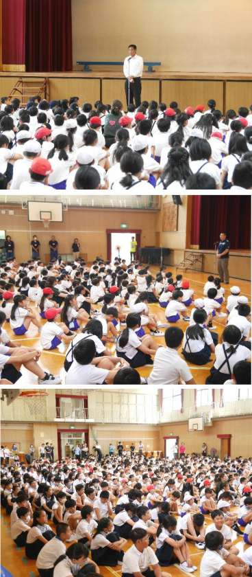 不審者がさり安全が確認できたところで、全校児童が講堂に集まって人数確認をおこないました。校長先生から22年前の付属池田小学校のお話と、明日は防災の日であることをお話しました。訓練をみていただいた都島警察署の方からもお話をいただきました。