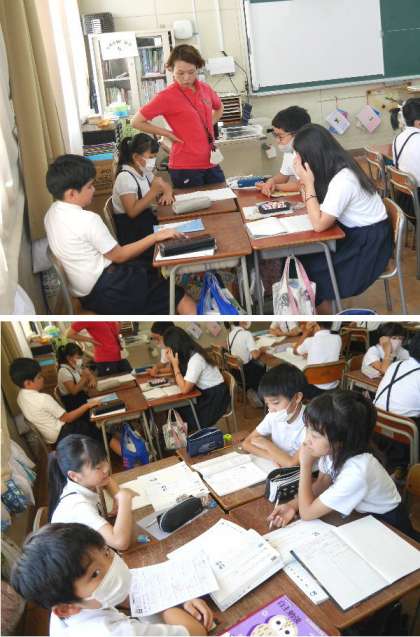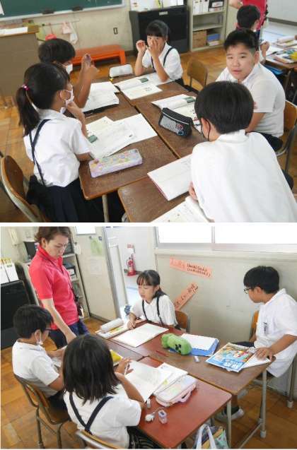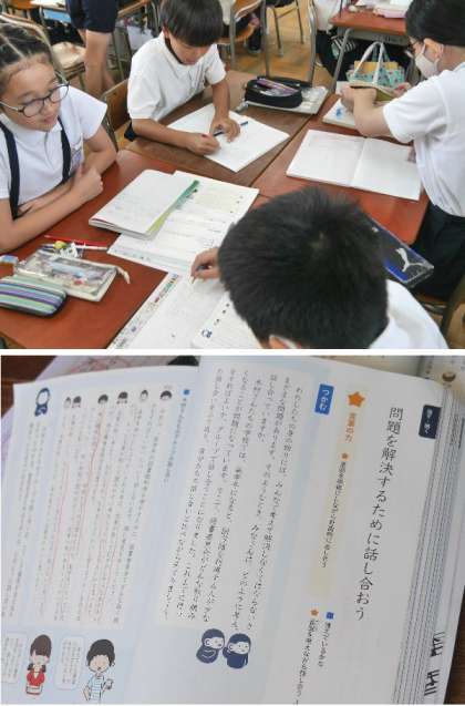 5年生の国語では、「問題を解決するために話し合おう」について学習をしています。グループで、よりよい学校生活のために、学校のよい点と課題を考えて議題を決めているところです。