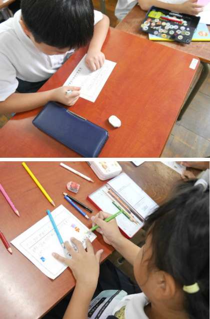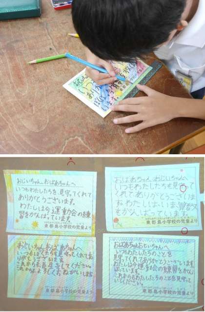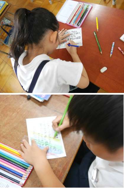 地域の敬老の方々へのメッセージカードを子どもたちで作っています。3年生と2年生が作っていました。