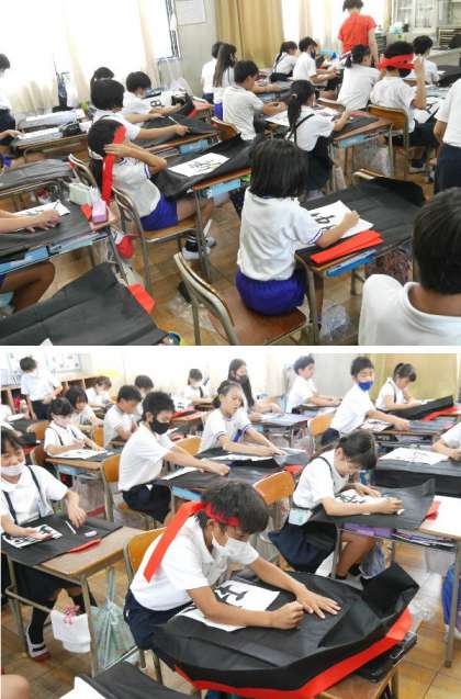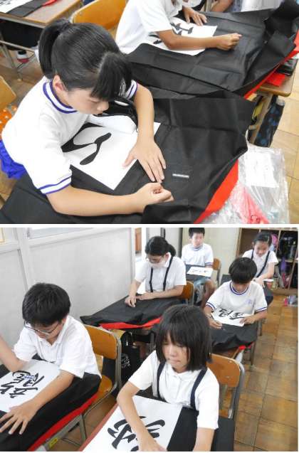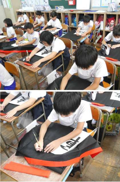5年生の運動会では、南中ソーランを踊ります。ソーランの演技中に着るハッピを作っています。出来上がったハッピの背中に、自分の名前の漢字1文字を描き込みます。
