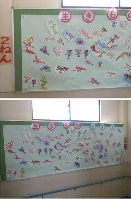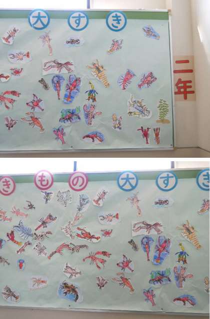 2年生の掲示板が新しくなりました。「生きもの大好き」で、いろいろな生き物の絵がはられています。2年生で飼っていたザリガニの絵がたくさん描かれています。