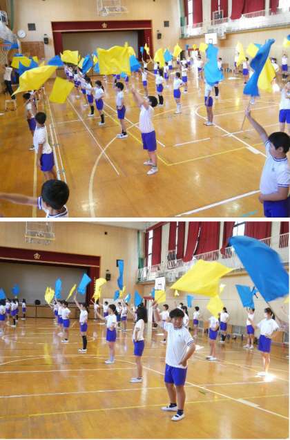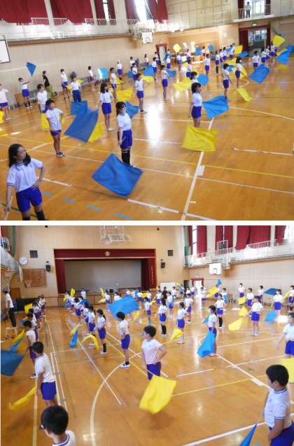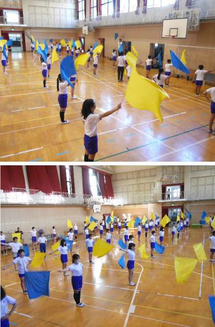 6年生の運動会練習では、旗をもっての演技練習に取り組んでいます。タイミングがむずかしいですね。