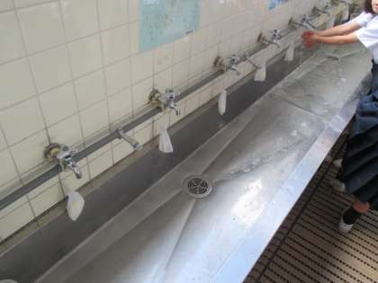 校舎内の水場には、蛇口ごとに石けんが配置されています。