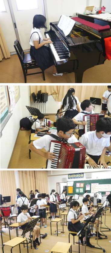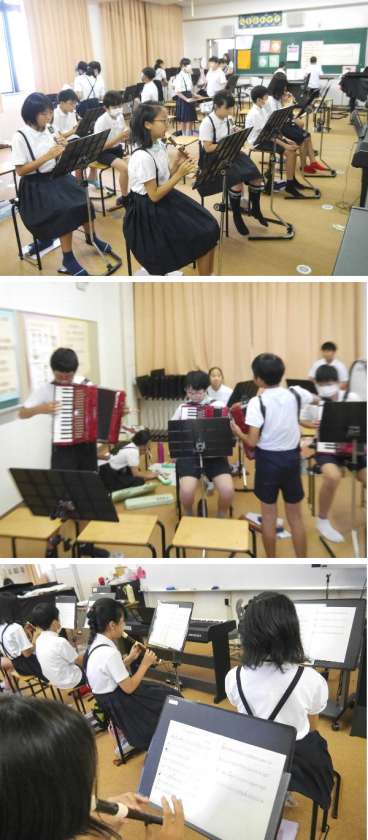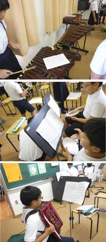 6年生がパートに分かれて合奏の練習をしています。曲はあのアニメ名曲の「ルパン」です。