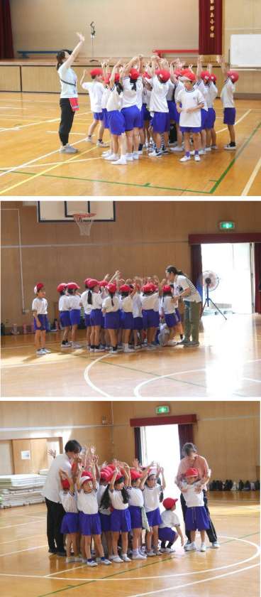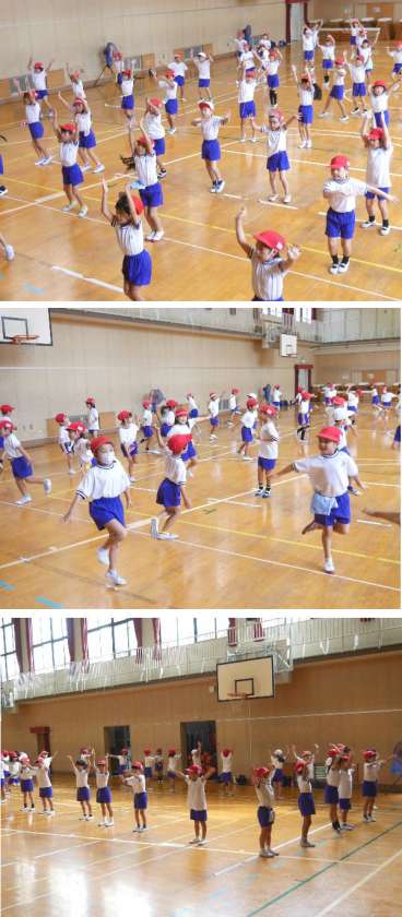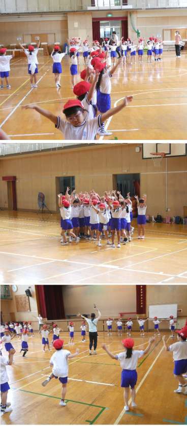 1年生が運動会の団体演技のダンスを練習しています。隊形を変えながら、学級ごとに輪になって、元気よく踊っています。