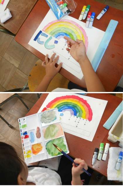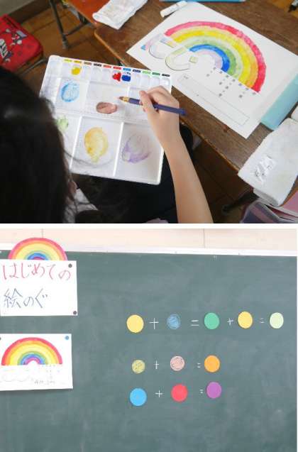 2年生では、絵の具を使って、にじを色塗りしました。色をまぜて、いろいろな色を作れるように練習です。