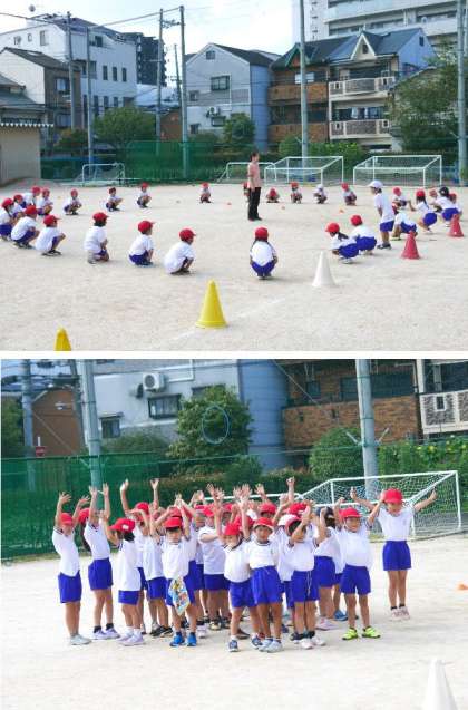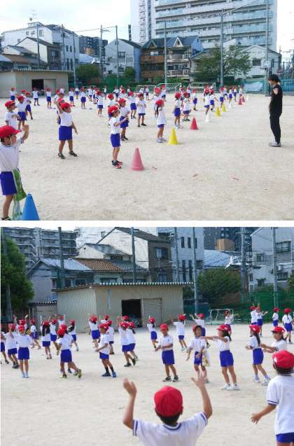 1年生の団体演技は、運動場での練習が始まりました。こまめに水分をとりながら、短時間で、運動場での位置を確認しています。