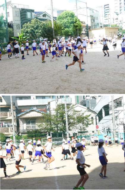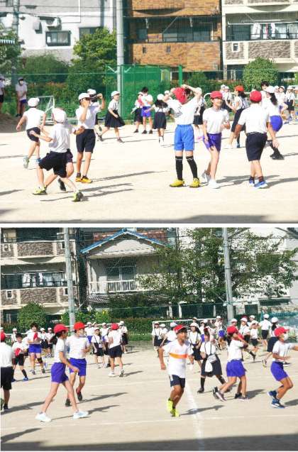 今日の児童集会は運動委員会による運動集会でした。ペア学年の3年生と5年生と運動委員で「ふえおにごっこ」をしました。帽子が白からつかまると赤に変えていきます。