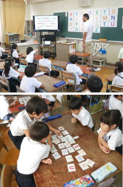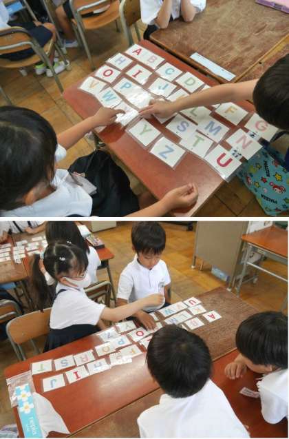 1年生の英語の授業にクリス先生が来てくれています。アルファベットのカードをつかって、アルファベットを学習していました。