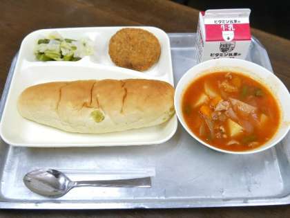 今日の献立は、チキンレバーカツ、ケチャップ煮、グリーンアスパラガスとキャベツのサラダ、おさつパン、牛乳でした。