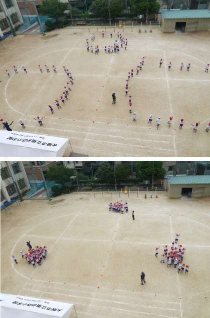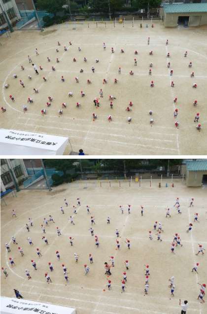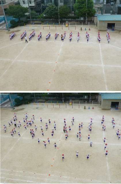 1年生は運動場で大きく広がって、入場からの団体演技の場所への移動を練習しました。