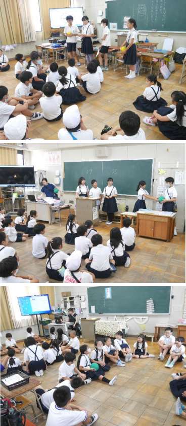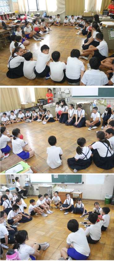 今日の児童集会は、たて割り班で、各教室でゲームをしました。しりとりばくだんゲームです。ボールをまわしながらしりとりします。