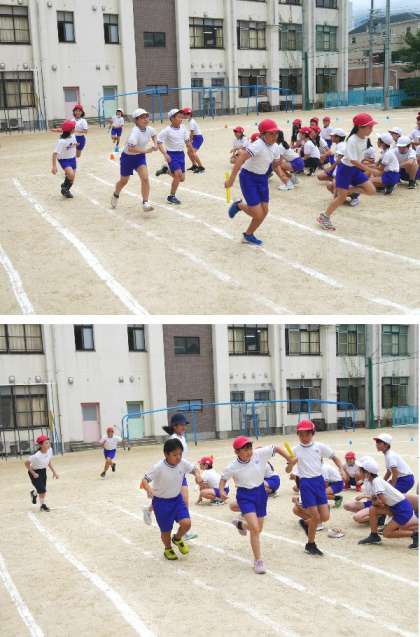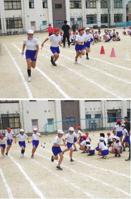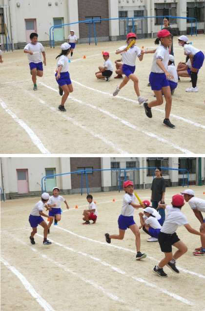 5年生がリレーの練習をしていました。対抗戦はもりあがります。