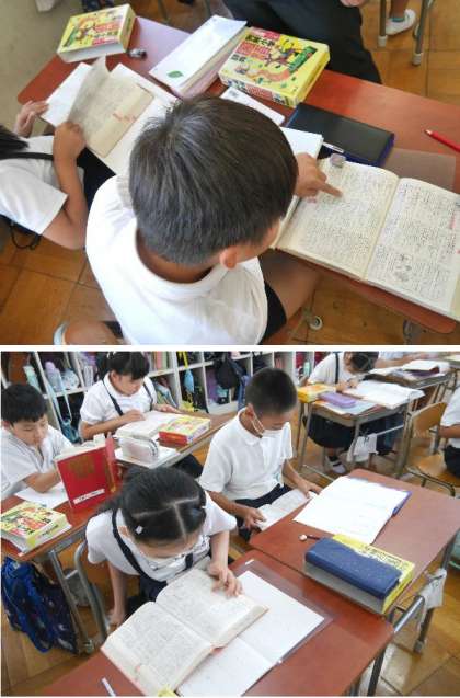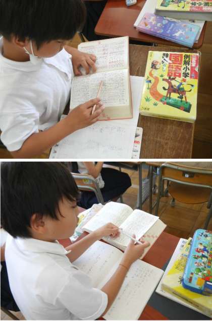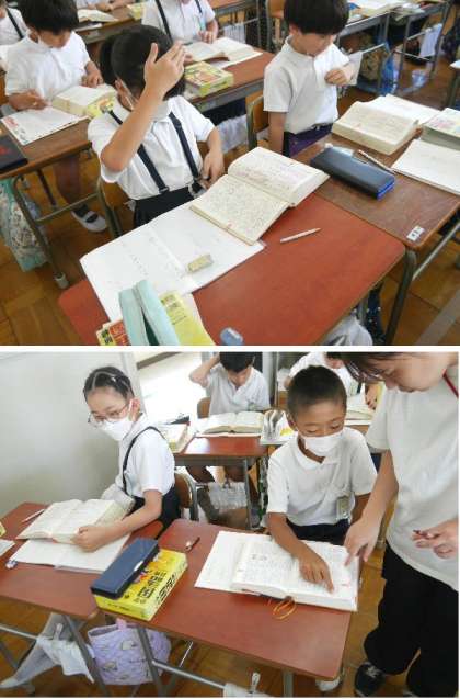 3年生の国語では、辞書を使って教科書にでてきた言葉を調べていました。国語辞典の使い方を学ぶことも大切です。
