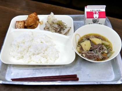 今日の献立は、肉じゃが、あつあげのみそだれかけ、キャベツの赤じそあえ、ごはん、牛乳でした。