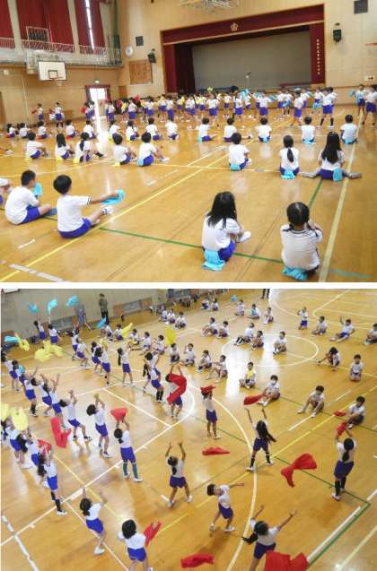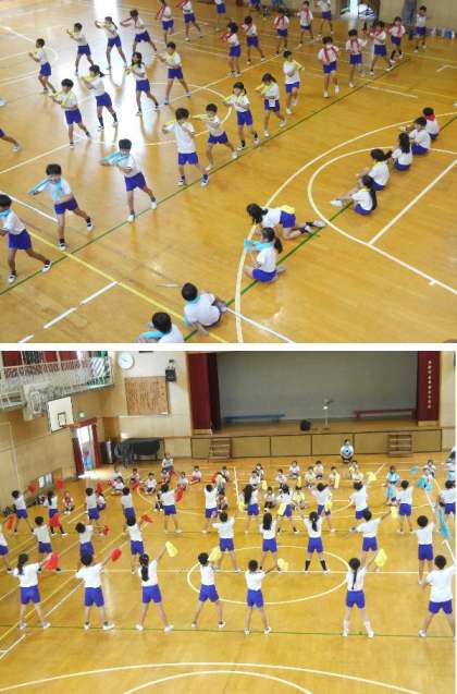 3年生は体育館で、団体演技の練習をしていました。演技をお互いに見せあって確認していました。