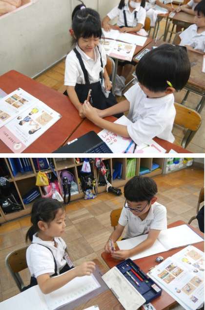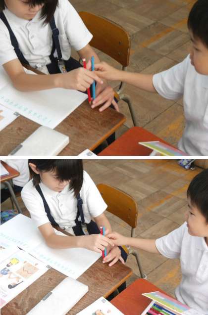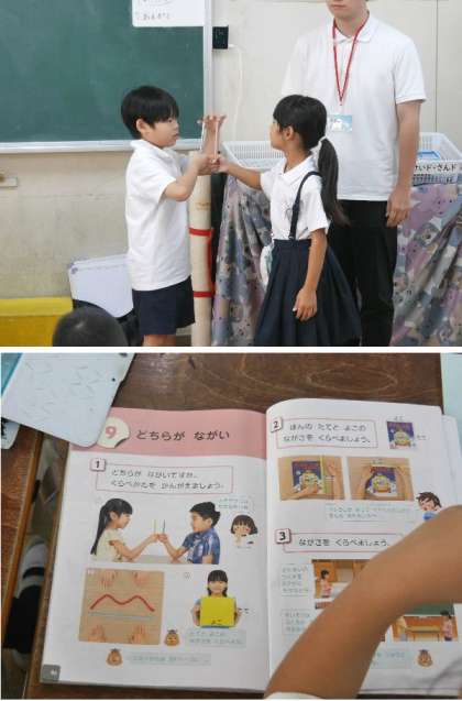 1年生の算数の授業です。子ども達がえんぴつをお互いに比べています。1年算数の単元「どちらがながい」を学習しています。どうしたら比べられるのか調べています。