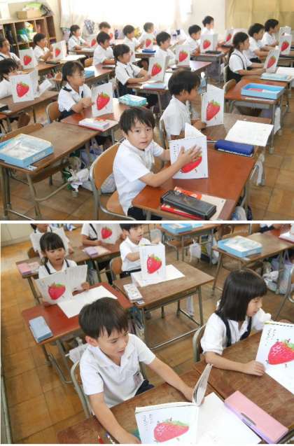 1年生が教科書ょを楽しそうに音読しています。「もこもこ さといも。ぽこぽこ さつまいも」と、言葉あそびの文を読んでいます。