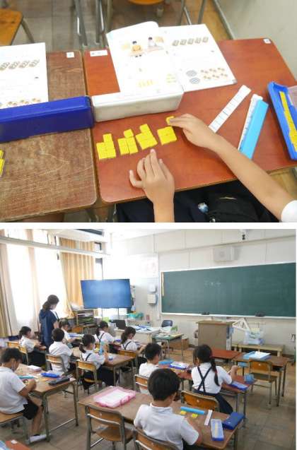 2年生では、かけ算の学習をしています。ブロックを使って、かけ算の5×4をあらわす学習をしています。