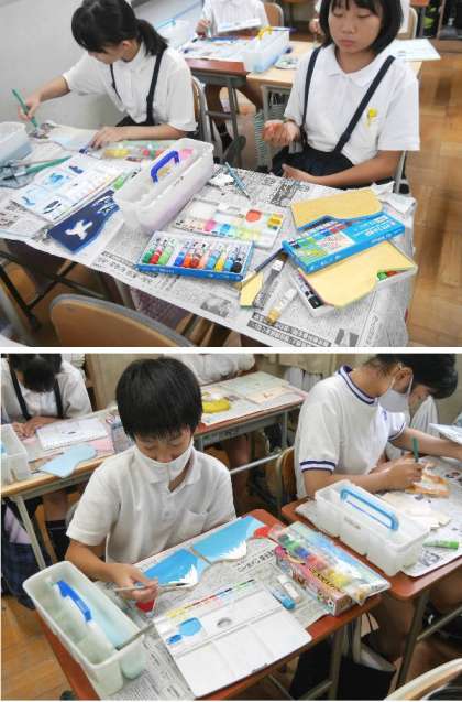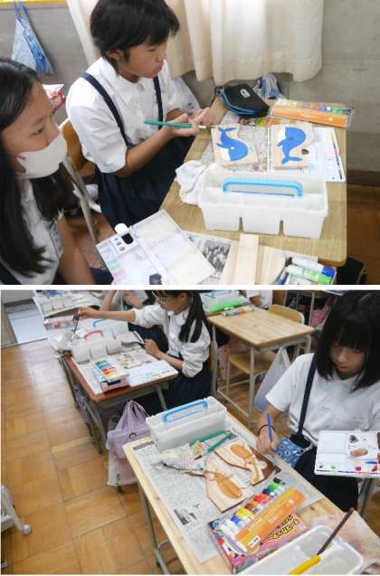 6年生の図工では、テープカッターづくりをしています。色を塗っています。