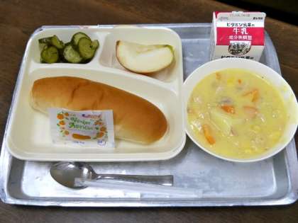 今日の給食は、豆乳コーンクリームシチュー、きゅうりのバジル風味サラダ、りんご、コッペパン、牛乳でした。