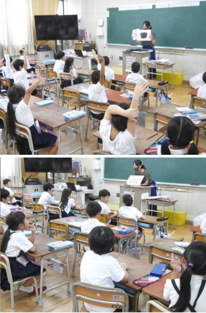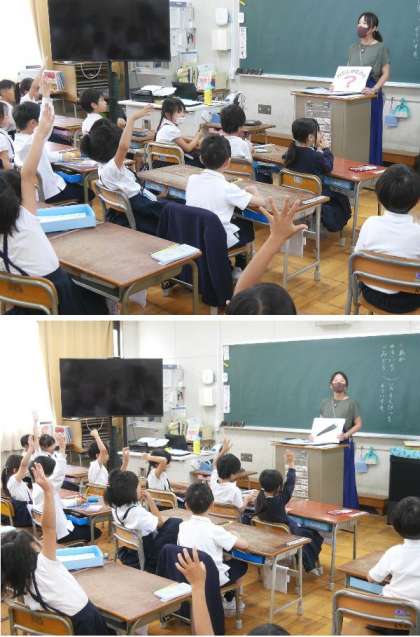 本校の栄養教諭の先生が、1年生で栄養指導をおこないました。「わたしはだあれ」と、給食のいろいろな食材をあてるクイズをしていました。子どもたちは、元気いっぱいに手をあげて答えています。