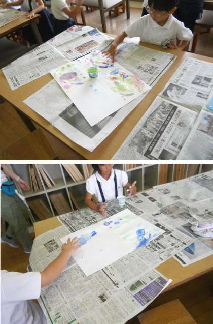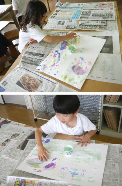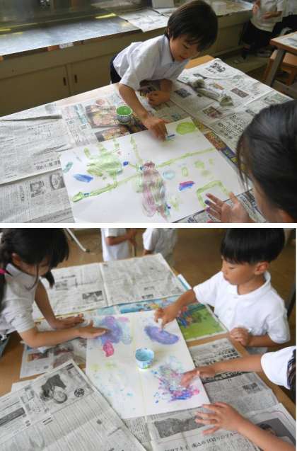 図工室で、1年生が絵の具を手を自由に塗ってアートを楽しんでいます。