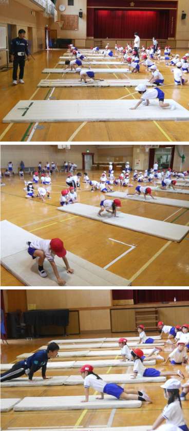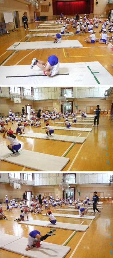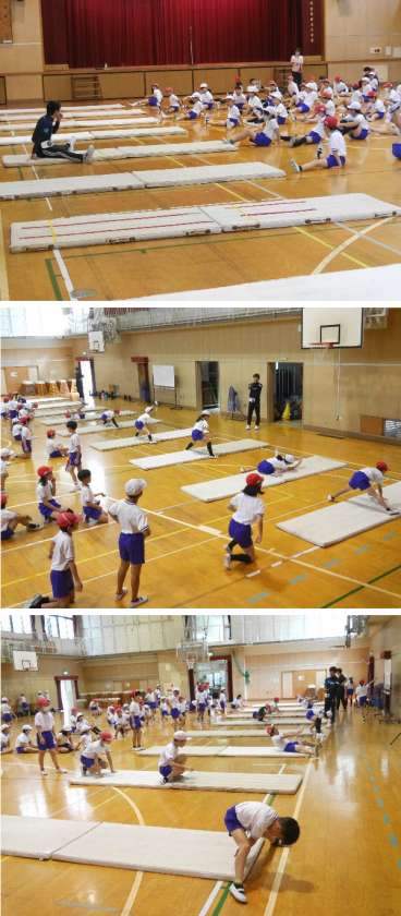 4年・3年・1年で、体育館でマット運動を教えてもらいました。各学年に応じた、マット運動の前転や後転、開脚前転、開脚後転などの練習をしていただきました。
